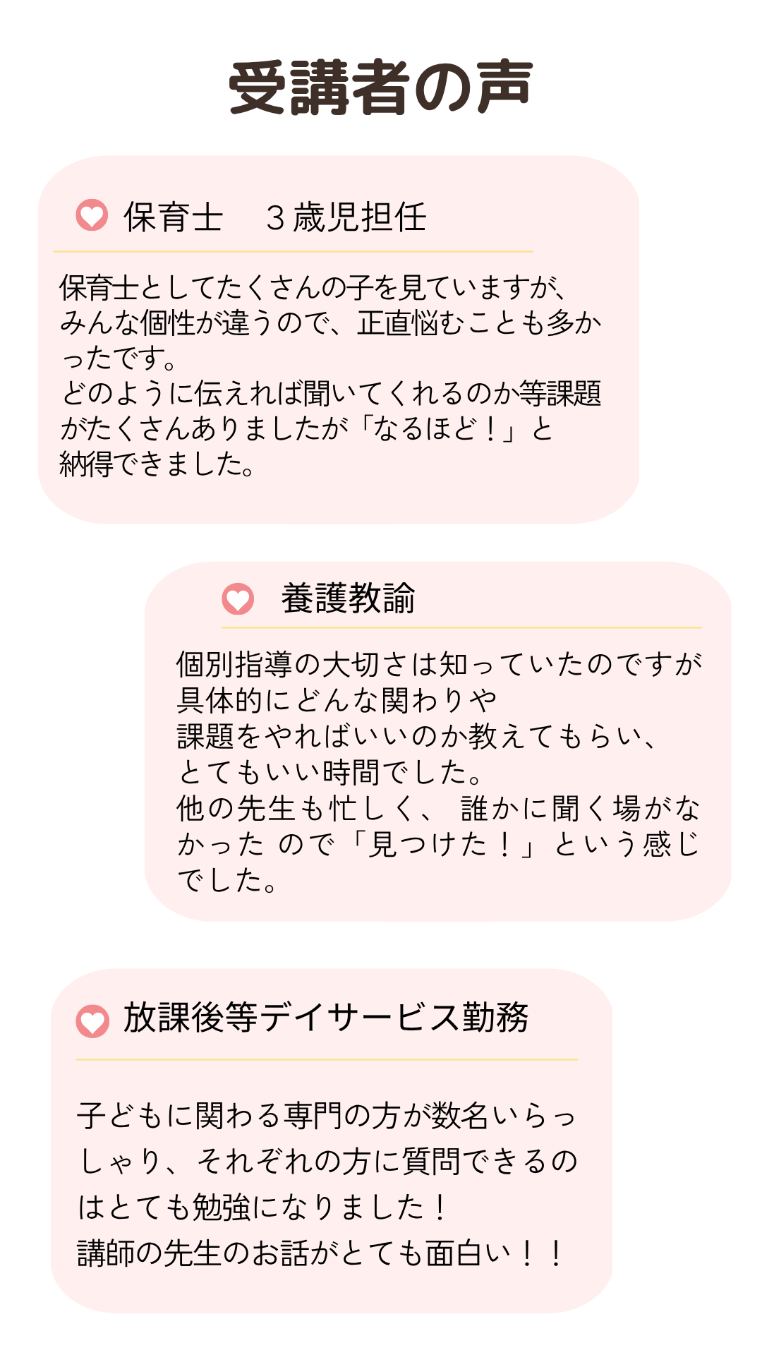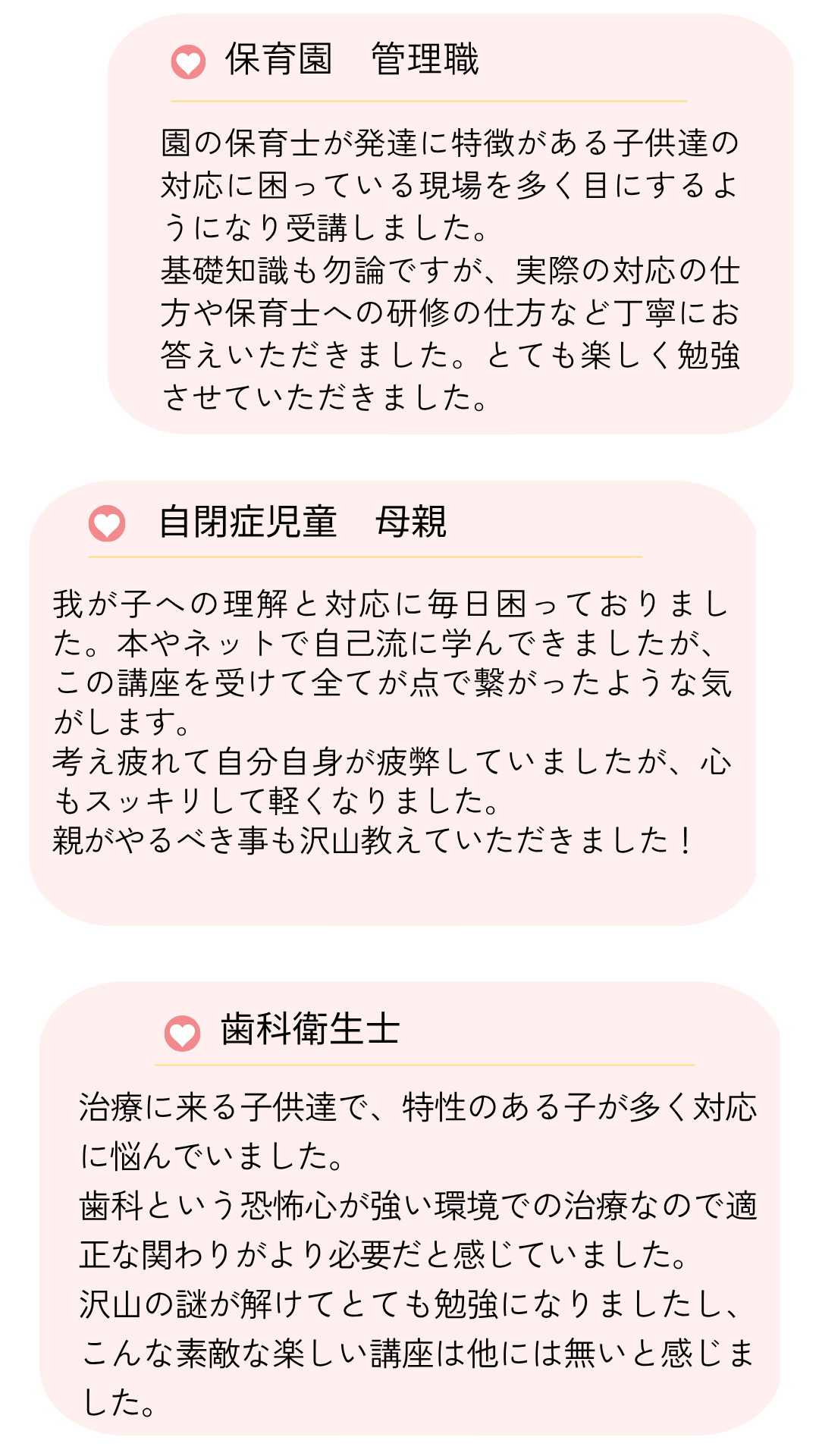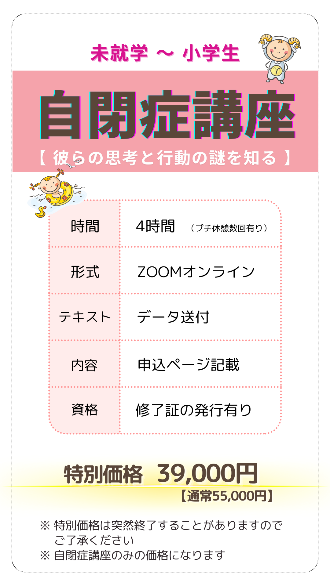 特に強みとしているのが自閉症児童への専門知識。2000組以上の親子をカウンセリング・指導してきた実績を持つ。現場の経験値を数多く持つ講師。